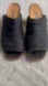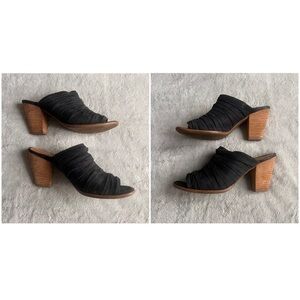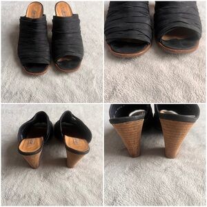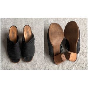 Great used condition. Avery Sandal by Paul Green in black with brown detailing. Contemporary artisan minimalist aesthetic, a great everyday shoe that transitions well between seasons. Strappy nubuck leather mule sandals with structured cage cutout leather upper, see video. Modest tapered block heel, slip-on styling and open toe. Note: light wear with streetwear to bottom sole, moderate toe impressions, light lifting and discoloration at insole, chip at leather/scuffing at heel & a few faint scuffs and light fading to upper, see photos. Paul Green (UK) size 6, listed as US 8.5, see photos for measurements.