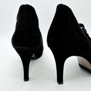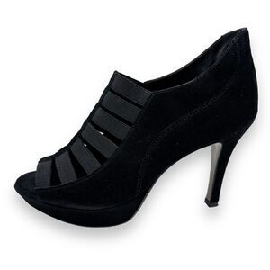 The elastic banding at the front of these black suede platform heels give these pumps a gladiator vibe. Suede wrapped stiletto heel. Open toe. Can be dressed for evening or down for work office career. Cute with jeans for a girls night out.
