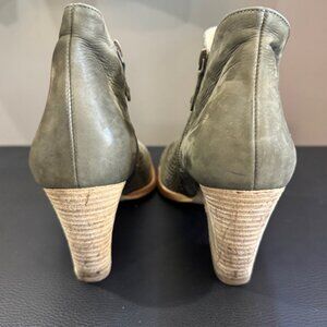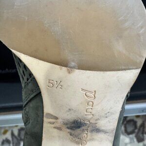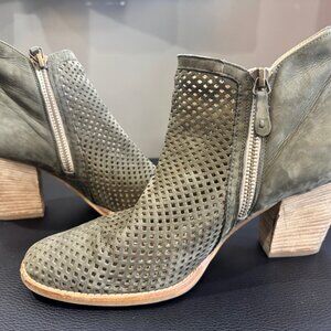 Paul Green "Bonzai" perforated nubuck leather ankle bootie. Olive green with a natural tan stacked heel. Excellent condition!