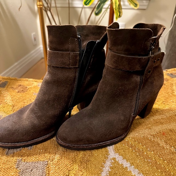 Dark brown suede Paul Green booties with side zipper. Size 7 and good condition. VERY comfortable!