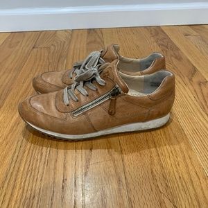 Paul Green Cage leather Sneakers in Tan cognac color. US Size 8.5 Paul green UK size 6. Top-zip closure distinguish this sporty sneaker furnished with a cushioned insole so it feels as good as it looks. • Lace-up style; side zip closure Very comfortable. Great pre owned condition No flaws, just normal wear