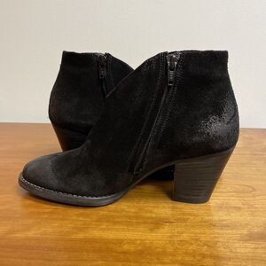 Black distressed suede-and-leather booties with scooped top-line Almond toe Side zip closure Stacked chunky block heel 2 3/4 Burnished-finish suede upper Leather lining and footbed Manmade outsole Made in Austria Excellent condition; Factory burnished/distressed finish at toe and ankle