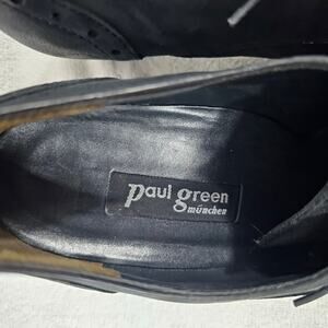 This pair of shoes is in excellent, pre-owned condition. Made of black leather, these Paul Green "Kelsey" wingtip oxfords have a stacked heel. There are a few signs of wear on the outer soles.