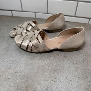 Chic and versatile leather metallic woven flats in a stunning gold-silver tone that complements any outfit. Crafted from genuine leather with a beautiful crisscross woven design and open toe, these shoes combine timeless style with comfort. Perfect for both casual and dressy looks, offering a subtle shimmer that elevates any ensemble.