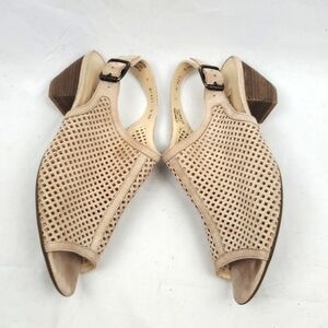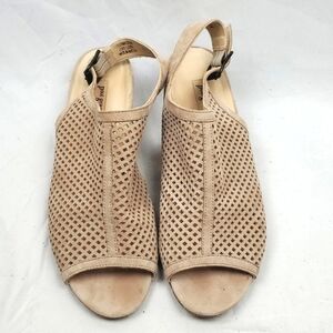 Paul Green Lois tan perforated suede peep toe slingback heeled sandal. Stacked block heel. Good condition, some minor wear to suede as shown in pictures. Size 6.