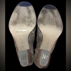 This is a gently worn pair of Paul Green Earth Metallic Malibu sliced booties. The color is a grayish taupe with a metallic sheen. Sz 5 1/2. The following is from the web…