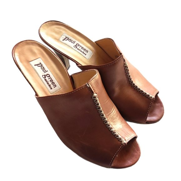 Paul Green tan mules; open toe; slip on; 3.21” heel; leather material.