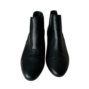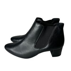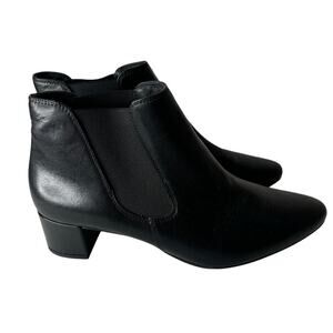 Paul Green Nell Hydro Water Resistant Leather Booties in Black. Size 6.5. Features pointed toe, block heels, elastic panel, leather upper and lining, rubber outsole, and slip-on style. Excellent pre-owned condition.