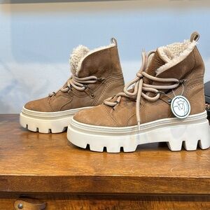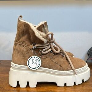 Paul Grren size 6/ US size 8.5. Chunky lugs lend all-weather traction to a cozy-chic hiking boot crafted from supple leather with plush shearling lining. 2 1/4" heel; 1 1/4" platform (size 6.5) 5" shaft Leather upper/genuine shearling lining/synthetic sole Imported