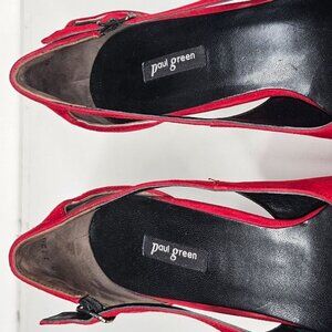 Tags: red suede heels, pointed toe shoes, Paul Green heels, buckle strap shoes, professional shoes, red high heels, stylish office shoes, suede dress shoes, elegant women's heels, cutout design shoes, formal wear shoes, leather insole heels, comfortable heels