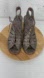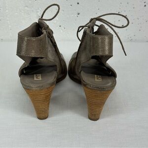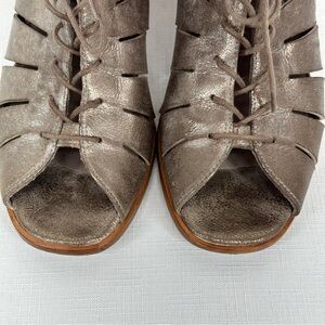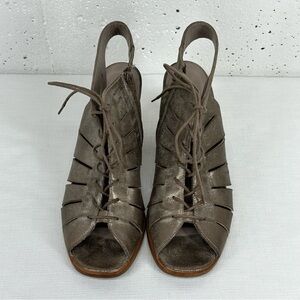 Paul Green US size 9.5 Pewter Distressed Leather Lace Up Open Toe Bootie 3.5 Inch Heels. There is some light signs of wear to body and some wear on the footbed (tiny part of corner by toe is lifting)