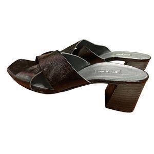 A block heel adds sophistication to a square-toe slide sandal topped by padded leather straps.