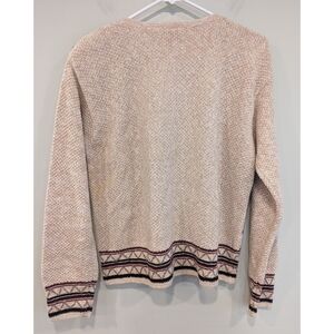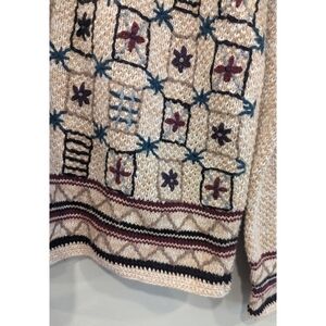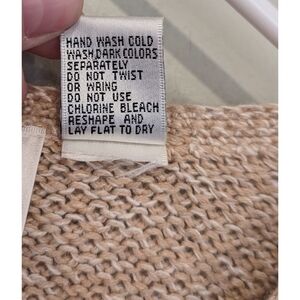 Excellent pre-owned condition. Paul Harris Design Vintage Tan and cream knit sweater. Cotton and ramie blend. Delicate embroidered detail on front. Full button cardigan. Size medium