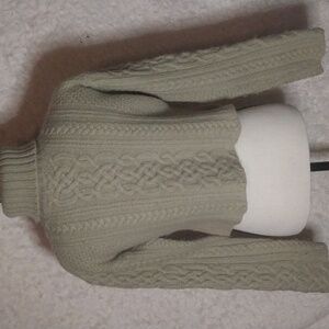 Paul James Women Cropped 100% Wool Fisherman Sweater Cable Knit Turtleneck Sage Green Size M