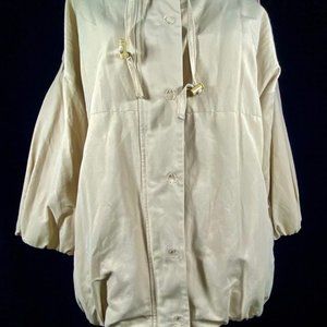 - 2 front pocket - has fleese lining inside - elastic on the sleeveds and waist - zipper and buttons in front