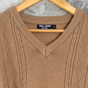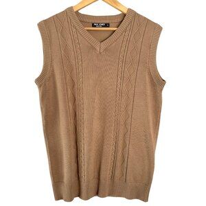 Paul Jones Mens Sleeveless Sweater Vest Size Medium Tan V Neck Argyle Cable Knit