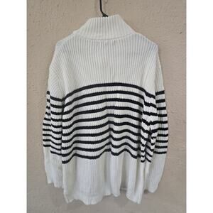 The Paul Jones Sweater is a stylish and versatile addition to any man's wardrobe. This Men's XL white and black striped long sleeve cardigan features a mock neck neckline and button accents for a classic look. The knit fabric is both breathable and comfortable, making it perfect for casual, workwear, or travel occasions during the winter and fall seasons. With a cable-knit style, pockets, and a regular fit, this cardigan is a must-have for outdoor activities or everyday wear.