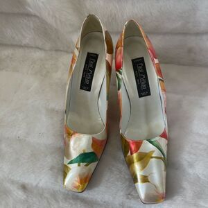 Paul Mèlian patent multi color marble prints slip on pumps square toe size 8M leather soles made in Spain pre owned in FAIR used condition because both of the heels have some scratches and one heel has a broken piece on the heel pad see all pictures any questions please message.