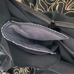 Paul Sachs Vintage 1950s Vintage Black Gold Dress with Removable Peplum medium in excellent condition no size or fabric content tag. Peplum is removable with snaps. Measurements laying flat chest 19 inches across waist 12 1/2 inches and length 44 inches long
