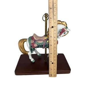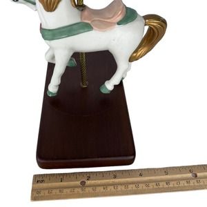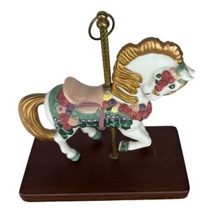 Paul Sebastian Ceramic White Carousel Horse Flowers Golden Mane & Tail Wood Base