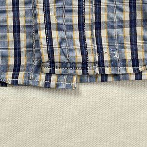 The shirt is pre-owned and in good condition. There is some damage from a hot iron or from dry-cleaning at the front and back shirt tail area. The shirt is faded and shows a small amount of wear. The shirt is without any other tears or marks. Take a look at the photos for more details.