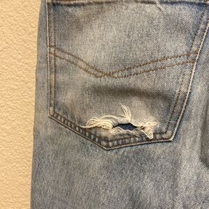 Light wash straight leg jeans from Paul & Shark. Manufacturer fading. Light distressing. Some paint marks. Size 32.