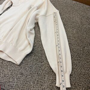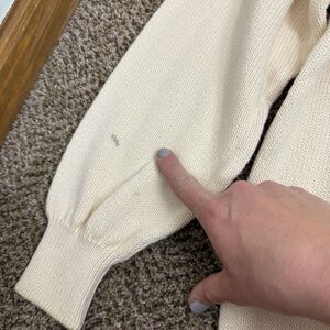 Sweater has some stains one on sleeve and small one on shirt. Please see pictures noted. Please see pictures for measurements.