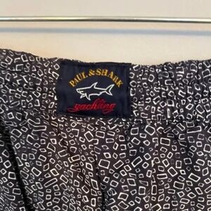 Paul & Shark Yachting Swim Shorts in men's Size Medium. Dark blue with white rectangle and square shapes on print. Shorts have interior mesh brief for added support and privacy, zipper pockets, and elastic waist with drawstring. Water / boating friendly shorts in very good used condition with no flaws or stains other than some minor wash wear. Please see close-up pictures for condition details. Prep. Preppy. Yacht. 100% polyester. Waist is elastic and measures approx 27.5 in around when unstretched, rise is approx 12 in, and inseam is approx 5.25 in.