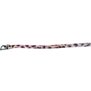 Beautiful beige pink and black leopard print skinny belt. Features a silver buckle and five holes for sizing.