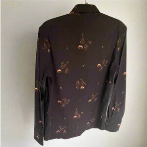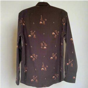 Made in Italy by Paul Smith, the popular English menswear designer. this breathable cotton button up features a saturated brown color embellished with a folk guitar print.
