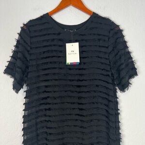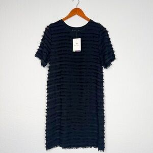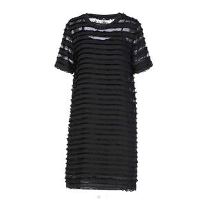 Constructed from a semi-sheer cloth, this short-sleeved black dress features a striped effect with fringe details all-over.