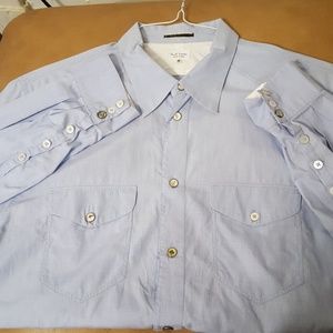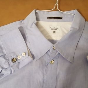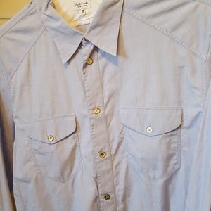 Paul Smith men's long sleeve dress shirt. Snaps and buttons decorate this beautiful two-pocketed blue chambray shirt. Size M, pit to pit 19, slim fit.
