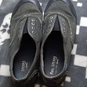 Paul Sperry Black Distressed Denim Look Laceless Slip On Sneakers Size 7.5. Soles & insoles have wear. Some minor thred pulls. See all photos above. Questions and offers welcome.