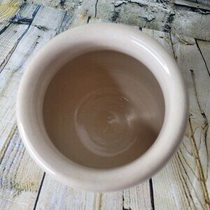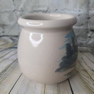 This Paul Storie pottery pot bowl planter showcases a beautiful and colorful barn scene, making it a standout piece for any collection. The rustic design and art pottery production style add unique character to the 6" high bowl, which features a 4" opening width and glossy finish. Handmade in Marshall, Texas, this original piece is made of clay and has a painted backstamp.