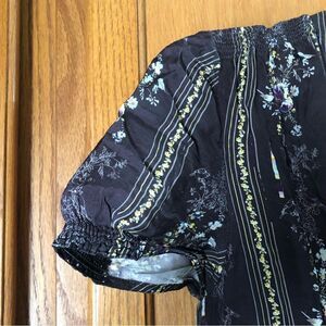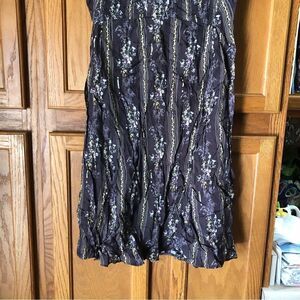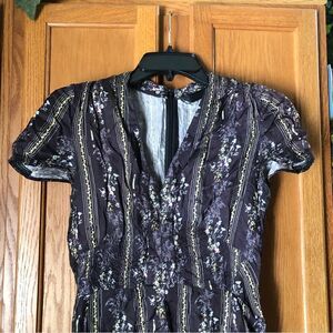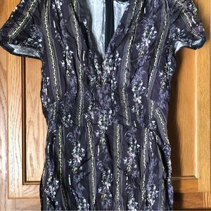 Features: V-neck, back zip closure, soft lightweight dark purple multicolored striped floral printed silk fabric, black label, ruffle hem & smocked waist accents, smocked cap sleeves, unlined, short length
