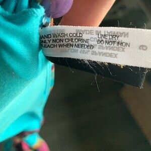 Halter swim top that ties around the neck and across the back. Mostly blue with pinks, purples and gold tones. Gold ring brings the two cups together in the center of the chest. Removable cups. Size 6. Excellent used condition. Matching bottoms sold in a separate listing.