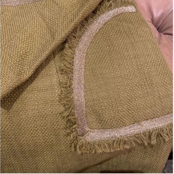 Features: zip up collarless long jacket, mid length coat, woven with raw edge metallic trim, 2 side slip pockets, 100% cotton, fully lined (polyester), simply gorgeous, classic, timeless luxury, quality made, versatile, wardrobe staple, vintage
