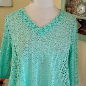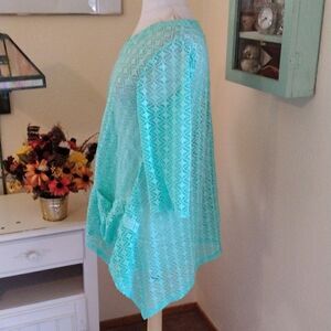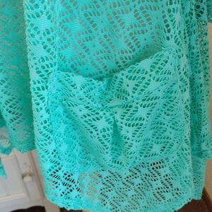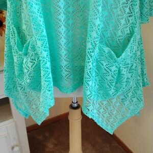 Made in the USA, like NEW. This top is lacy and cool. Longer on the side. Large pockets in front. Size S ( please see measurements) 42 at chest, 80 at bottom hem. 29 long at front, 34 at points, from shoulder to hem. 17 inch sleeves. Perfect at a topper over a cami, or a swimsuit cover-up.