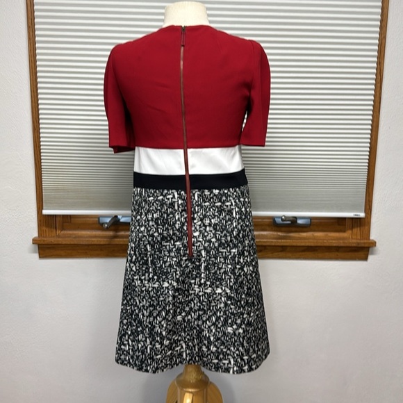 This elegant women's dress features a striking red top with a black and white patterned skirt. Perfect for any occasion, it combines style and comfort effortlessly. Back zipper closure. Lined.