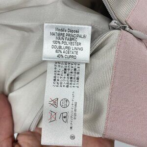 Black skirt with nude satin top and pink fabric belt detail, back zipper closure, knee length, cap sleeves, crew neckline, lined