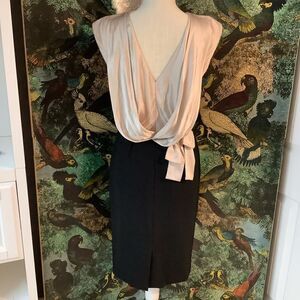 This a stunningly beautiful silk dress bodice with black polyester pencil skirt. Look at the back drape- just gorgeous! Very nice quality. Size 38.
