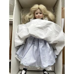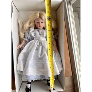 Pauline Bjonness-Jacobsen porcelain doll, Alice model dressed in a light blue and white dress reminiscent of Alice in Wonderland. These collectible dolls are known for their delicate features, hand-painted details, and limited edition releases. Pauline Bjonness-Jacobsen was an Australian artist who specialized in creating these unique porcelain dolls. The doll is in good condition and collectible due to its limited edition status and the artistry involved in its creation.