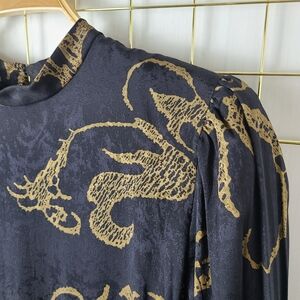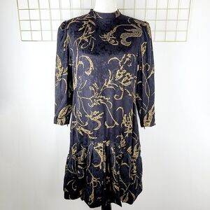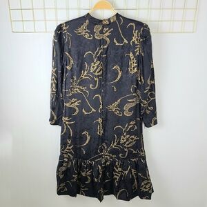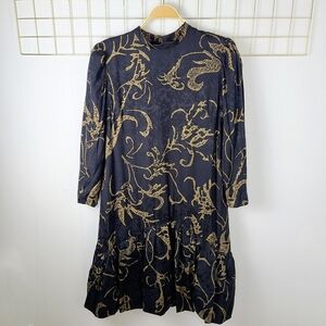 Tags: black, gold, jacquard, long sleeve, flounce hem, drop waist, modest, evening, special occasion, wedding quest, 70s, 80s, vintage