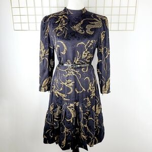 Pauline Trigere Black Gold Jacquard Drop Waist Evening Vintage Dress. Features a jacquard print, high neck, with a drop waist and flounce hem. Back zipper. Fully lined. Zipper detail at cuffs. Elegant and chic. No material tag. Minor age wear near edge of collar, slight age wear to lining, see photos. Given its age, very good condition.