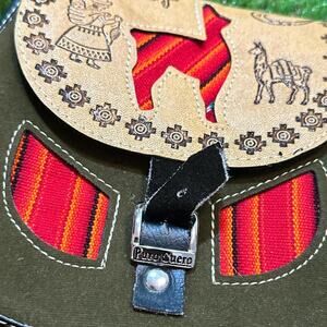 Step into unique artisan fashion with this *Paulo Cuervo Handcrafted Peruvian Style Saddle Bag.* Featuring rich olive green and brown tones, accented with vibrant traditional Peruvian textile designs, this bag offers a perfect balance between style and culture. The engraved leather flap features motifs of Andean life, such as llamas and folkloric figures, adding a distinctive touch to the overall aesthetic. Ideal for carrying your essentials with flair and an appreciation for handmade artistry.