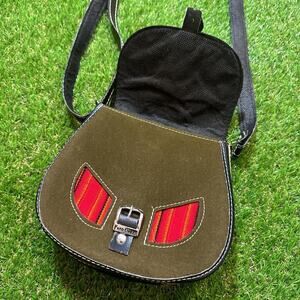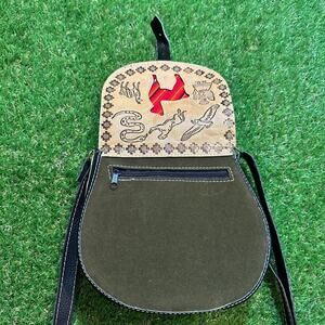 Step into unique artisan fashion with this *Paulo Cuervo Handcrafted Peruvian Style Saddle Bag.* Featuring rich olive green and brown tones, accented with vibrant traditional Peruvian textile designs, this bag offers a perfect balance between style and culture. The engraved leather flap features motifs of Andean life, such as llamas and folkloric figures, adding a distinctive touch to the overall aesthetic. Ideal for carrying your essentials with flair and an appreciation for handmade artistry.