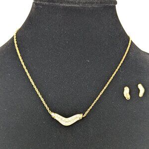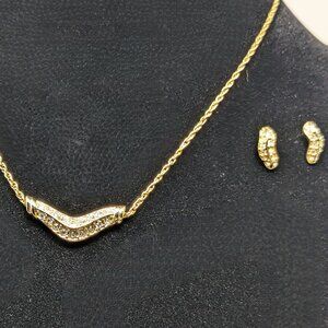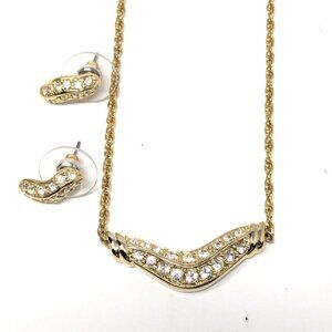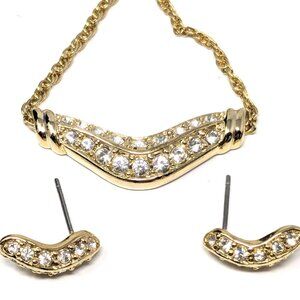 Pave Crystal Boomerang Necklace Earrings Set Gold Tone 17.5" Unsigned Fragments