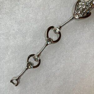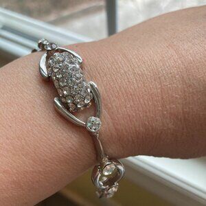 Gorgeous bracelet with pave set crystals on the center and bezel set stone accents. Finished in silver tone. Approx. 7", and has a fold over clasp. In great condition! It has a high end look and design!
