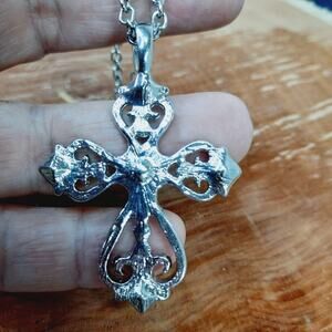 Pave Style Cross Necklace w/Rhinestones & Hearts at each point. Silver colored. Preowned excellent condition. No tarnishing.