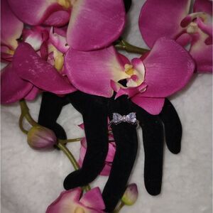 This elegant ring has stones in the shape of a bow. Smaller encrusted crystals on the bow center and on either side.